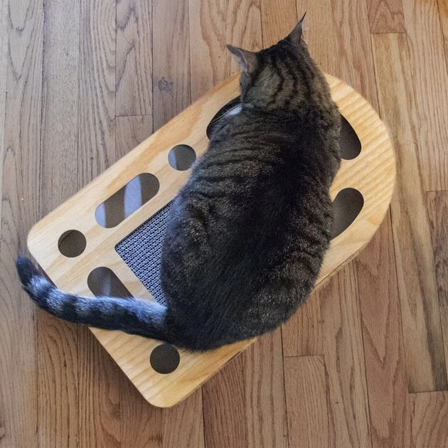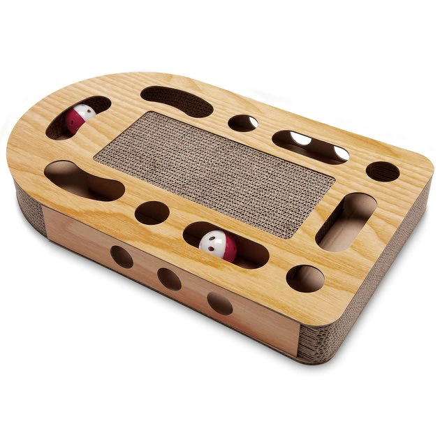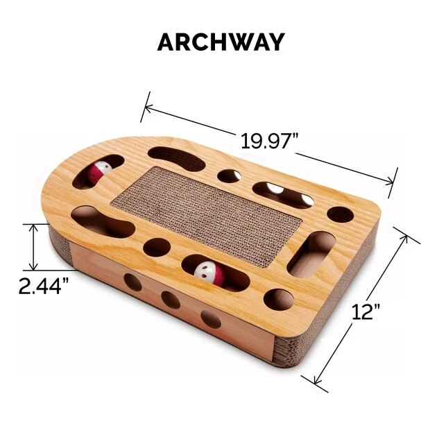 Engage, excite and entertain your feline friend with the FurHaven Busy Box Corrugated Archway Cat Scratcher with Catnip & Two Balls. This interactive archway-shaped box features holes both on the top and sides so your cat has multiple access points to get to the jingly bell balls inside. Your girl can swat and bat away at the balls then use the eco-friendly scratching surface for a purr-fect nail scratching session. The surface is made from recycled materials and works paw-somely when you sprinkle catnip on top to attract your curious cat for tons of playtime fun.