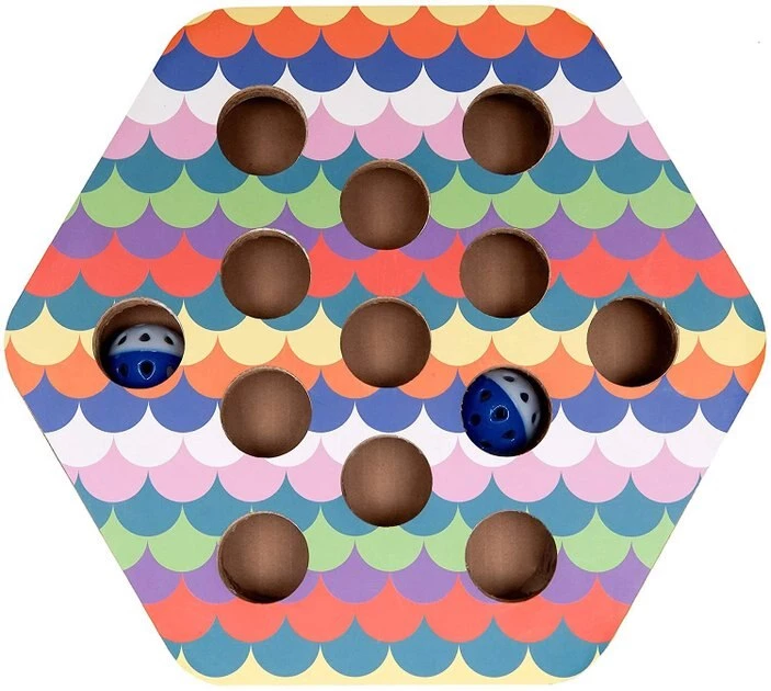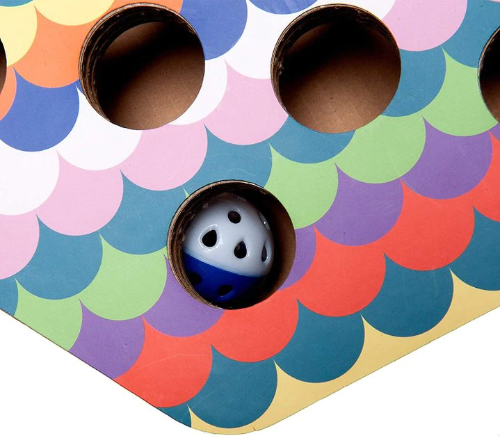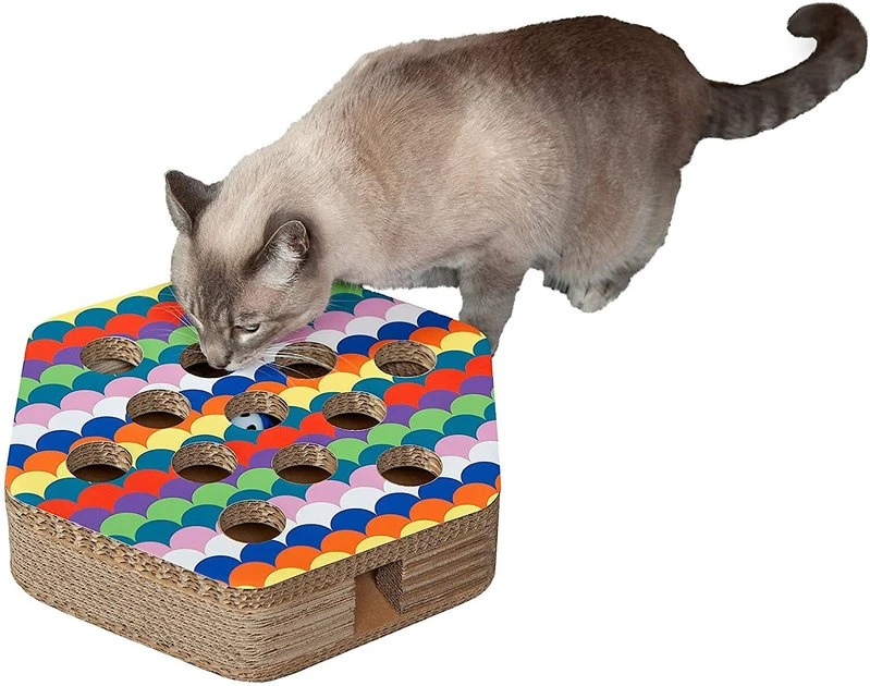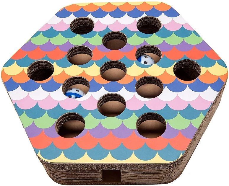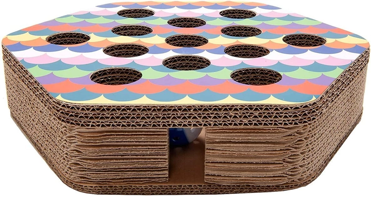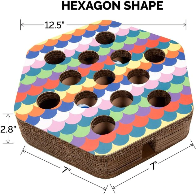Help keep your kitty’s claws away from your furniture with FurHaven’s Busy Box Corrugated Hexagon Cat Scratcher Toy with Catnip. Your cat can scratch and stretch away with this eco-friendly cat scratcher—it’s made from recycled materials, and is completely recyclable itself! This cat scratcher includes catnip to help lure your feline friend away from your tables and chairs. You can also help keep your furbaby entertained with its interactive busy box design complete with jingle bell balls and holes in the top and sides.