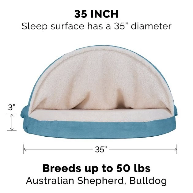 Give your furry friend a cozy and private place to relax with the FurHaven 35-in Faux Sheepskin Snuggery Memory Top Foam Pet Bed. This burrow-style bed features a soft hood with a flexible and removable hoop to let your paw-tner snuggle and burrow or use it as a blanket. The memory foam of this bed works with the weight of your companion to contour to her body for better overall support and relief from muscle pain and joint discomfort. It also has soft suede fabric on the exterior and gusset that resists stains and cleans up easily while adding a bit of style. With plenty of colors to match your home décor and a portable design, FurHaven Faux Sheepskin Snuggery Memory Top Foam Pet Bed is a welcomed addition to any home with furry little ones.