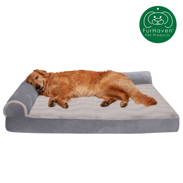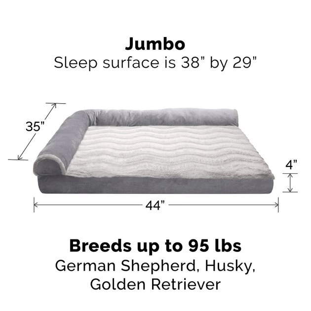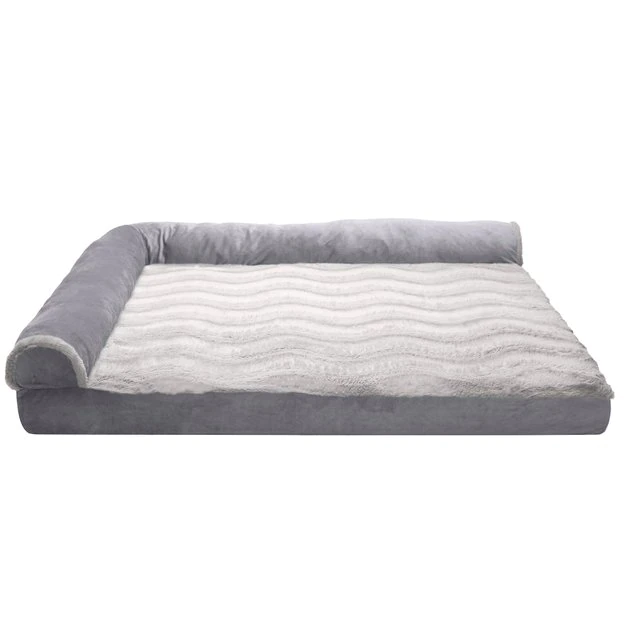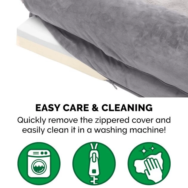 Introduce your furry friend to a new level of comfort with the FurHaven Wave Fur and Velvet Memory Foam Deluxe Chaise Dog and Cat Bed. This comfy bed features velvet-covered L-shaped bolsters for back and hip support along with an ultra-plush faux fur sleeping surface. The two raised and rounded bolster ends also help your buddy rest his paws and neck for better spine alignment. The memory foam base is designed to work with your pet’s weight and contour to his body—helping to relieve aching joints and pressure points. And the zippered cover is easily removed and machine washed for convenient cleaning. Just pick the perfect size for your pal and let the relaxation begin!