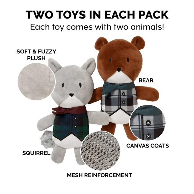- Your canine comrade will have a ball playing with her soft, fuzzy bear and squirrel.