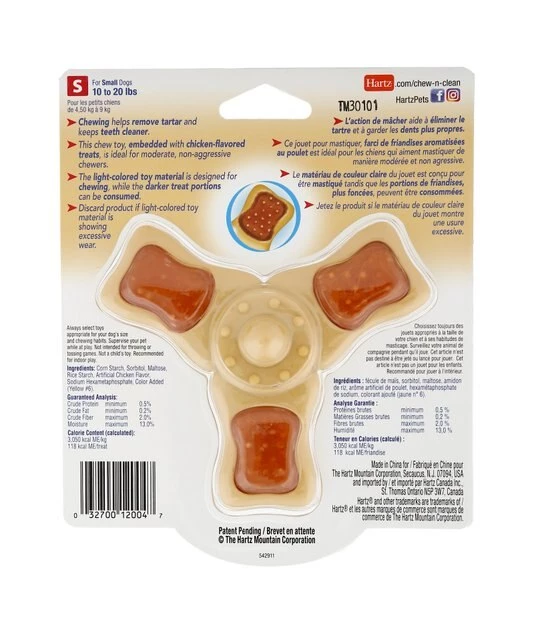 Take playtime to the next level by adding the Hartz Chew ‘n Clean Chicken Flavored Tri-Point Toy to your canine’s toybox! This chew toy is embedded with chicken-flavored treats, making it super engaging. Paw-fect for moderate chewers, it features a sturdy nylon shell. The exterior is covered with contours and nubs that work to clean teeth and massage gums while your pal chews the day away. Furry friends can also easily hold the toy with their paws or in their mouth, thanks to the tri-point shape. This multifunctional toy is sure to become a favorite with your best bud!