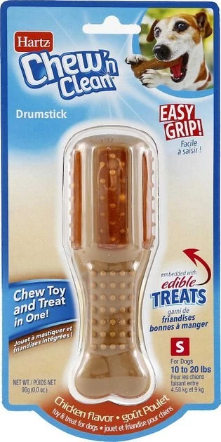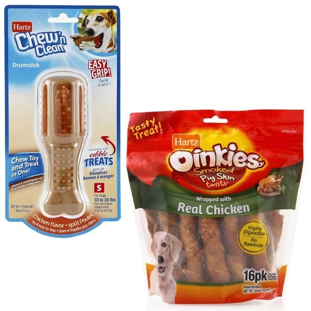 Your best fur-iend won’t want to let go of Hartz Chew ‘n Clean Chicken Flavored Drumstick Treat & Chew Toy + Oinkies Smoked Pig Skin Twist Wrapped with Real Chicken Dog Treats! The tasty toy is embedded with chicken-flavored treats to keep your pup engaged, while a drumstick shape makes it easy to hold in his paws. The twisty sticks are made from all-natural pig skin, an easy-to-digest alternative to rawhide that’s just as satisfying to chew. Best of all, the toy and treats both work to clean your pal’s teeth and massage his gums as he chews the day away.