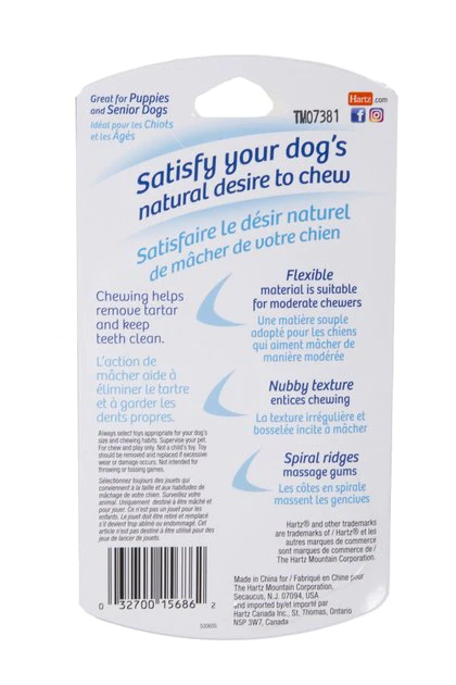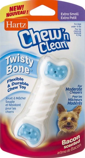 Help protect your pup’s dental health with Hartz Chew ‘n Clean Twisty Bone Bacon Scented Flexible Dog Chew Toy. This toy has twisty middle ridges that offer a firm grip and help massage gums. The nubby textured ends entice chewing and are enriched with a tempting bacon scent to keep your furry friend interested. Hartz Chew ‘n Clean Twisty Bone Bacon Scented Flexible Chew Toy helps keep teeth and gums clean to reduce the build-up of plaque and tartar for most dogs–especially puppies and seniors.