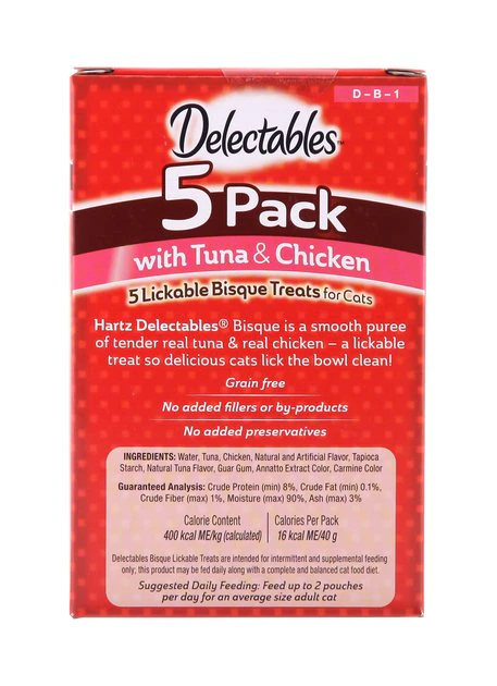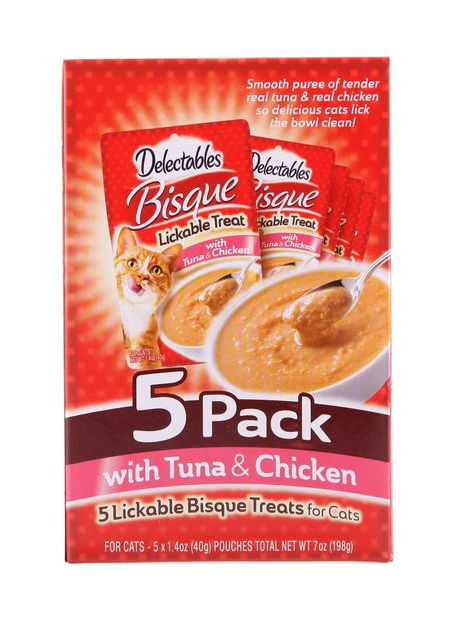 Give your cat a new way to snack with the Hartz Delectables Bisque Chicken & Tuna Lickable Cat Treat. Because he’s extra special, you need an extra special way to give him a reward. Simply open the pouch, pour into his bowl, and let him enjoy the tender pieces of goodness. Moist and delicious, it makes the perfect snack for in between meals. It’s also a great topper for dry food, with a creamy puree of real chicken and fish that easily mixes in and entices him to gobble up every last bite. Any way you serve it, this lickable treat will leave him licking his chops!