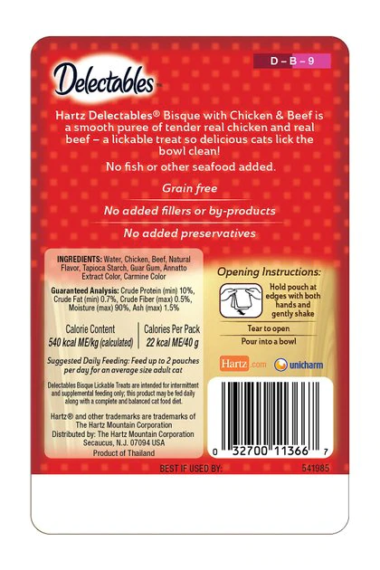 Help your mini mate make it through the day with Hartz Delectables Bisque Non-Seafood Chicken & Beef Lickable Wet Cat Treats. These unique, lickable liquid treats for cats are blended to create a delicious and delightful snack for your sidekick. They are made with a creamy, seafood-free recipe that combines tender, real chicken with rich, meaty beef and a savory broth. These liquid cat treats are paw-fect for senior kitties who have trouble chewing and can be used as a food topper for other cats too! They are packaged for your quick-serving convenience in handy, easy-to-open, single-serve pouches just for your precious pal.