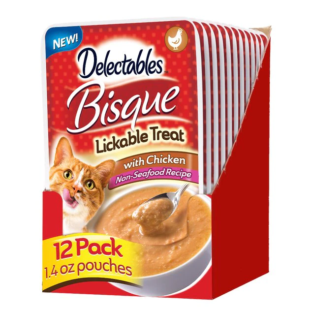 Your feline friend won’t be able to resist the delectable taste and creamy texture of Hartz Delectables Non-Seafood Chicken Recipe Bisque Lickable Wet Cat Treats. This nutritious, seafood-free bisque features tender chicken, broth and other nutritious ingredients blended to a liquid consistency for easy-to-lap eating—a great option for senior kitties! The single-serve pouch makes it a cinch to offer your precious pet a quick treat or an enticing meal topper.