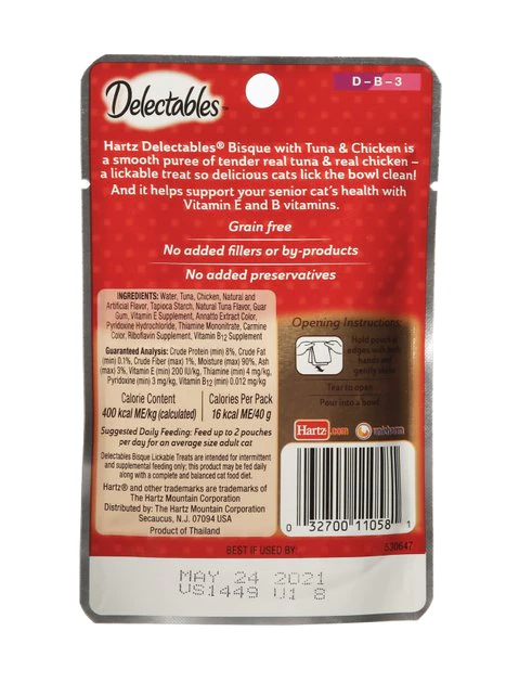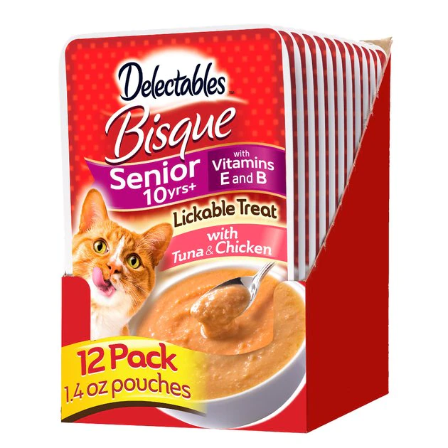 Hartz Delectables Bisque Senior 10+ Tuna & Chicken Lickable Cat Treat is a deliciously unique, single serve, wet treat cats purr for. Your cat will enjoy this yummy combination of tender, real tuna and chicken with delicious juices blended into a creamy purée. Formulated with vitamins E and B, this treat is made to support the health of your aging cat, 10 years and over. Make every treat time something truly special with this lickable, tasty treat your cat will crave.