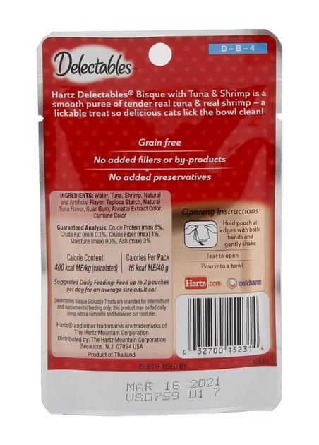 Hartz Delectables Bisque Tuna & Shrimp Lickable Cat Treat is a deliciously unique, single serve, wet treat cats purr for. Your cat will enjoy this yummy combination of tender, real tuna and shrimp with delicious juices blended into a creamy purée. Make every treat time something truly special with this lickable, tasty treat your cat will crave.