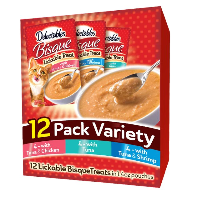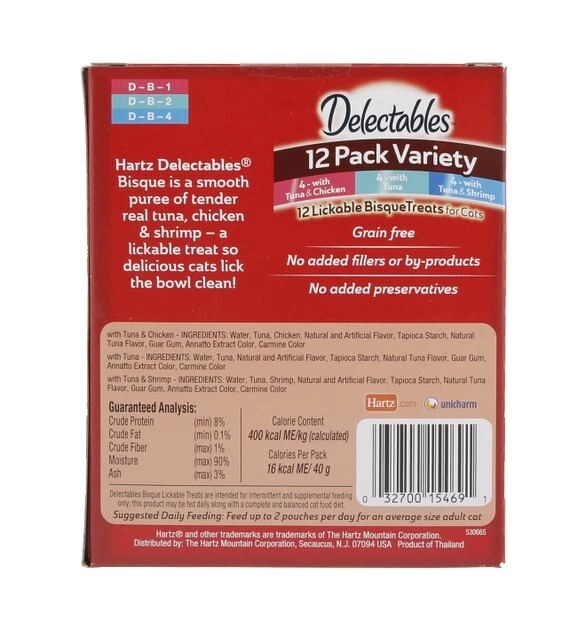 Treat your kitty to the best of both land and sea with Hartz Delectables Bisque Variety Pack Lickable Cat Treats. Each case comes with 12 Bisque packets in three different recipes—Tuna & Chicken, Tuna, and Tuna & Shrimp. Hartz Bisque recipes offer a smooth texture that’s sure to please the finickiest felines. These delicious and nutritious gourmet lickable cat treats are crafted with either real fish or chicken for the high-quality protein your BFF deserves! Simply open the pouch, pour it into a bowl, and let him enjoy the rich reward as a snack between meals or as a tasty kibble topper. Any way you serve it, these purr-worthy treats will leave your cat licking his chops!
