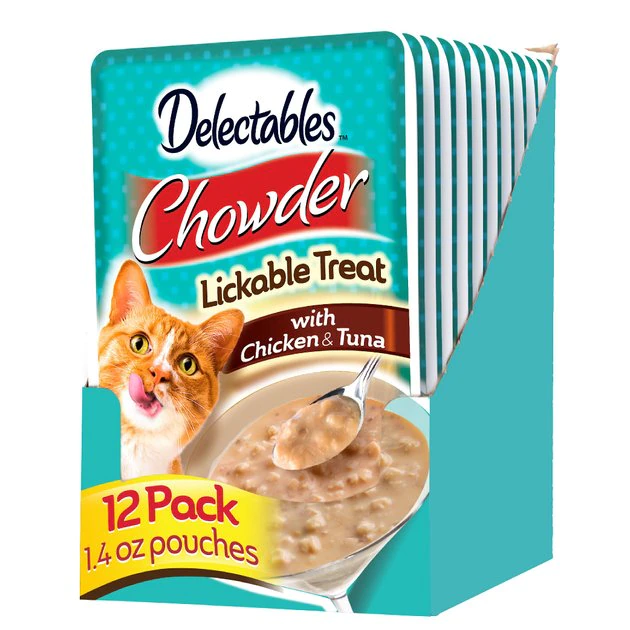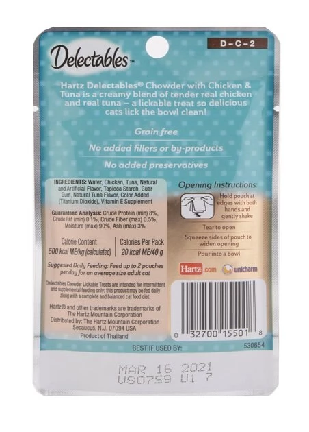 Give your cat a new way to snack with the Hartz Delectables Chowder Chicken & Tuna Lickable Cat Treat. Because he’s extra special, you need an extra special way to give him a reward. Simply open the pouch, pour into his bowl, and let him enjoy the tender pieces of goodness. Moist and delicious, it makes the perfect snack for in between meals. It’s also a great topper for dry food, with real meat and a creamy sauce that easily mixes in and entices him to gobble up every last bite. Any way you serve it, this lickable treat will leave him licking his chops!