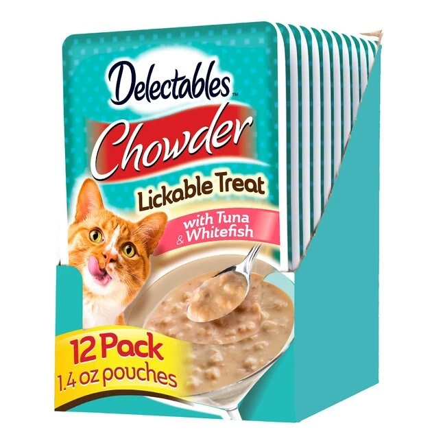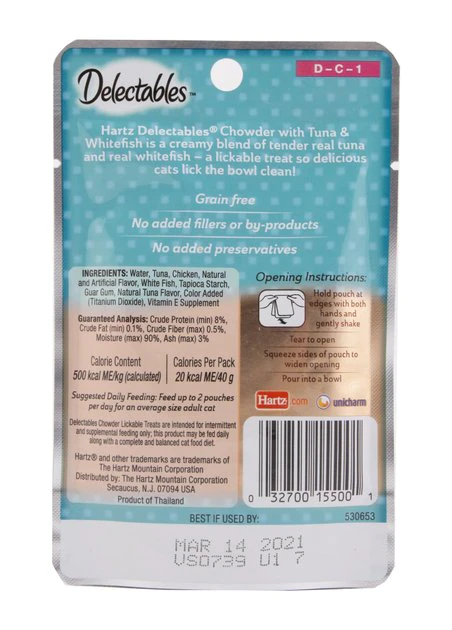 Give your cat a new way to snack with the Hartz Delectables Chowder Tuna & Whitefish Lickable Cat Treat. Because he’s extra special, you need an extra special way to give him a reward. Simply open the pouch, pour into his bowl, and let him enjoy the tender pieces of goodness. Moist and delicious, it makes the perfect snack for in between meals. It’s also a great topper for dry food, with real meat and a creamy sauce that easily mixes in and entices him to gobble up every last bite. Any way you serve it, this lickable treat will leave him licking his chops!