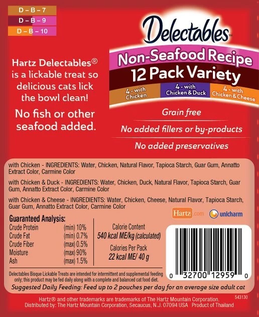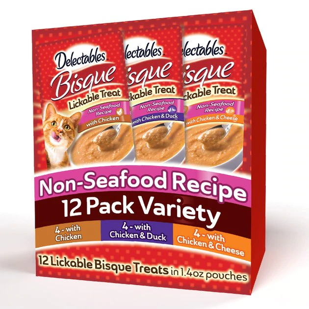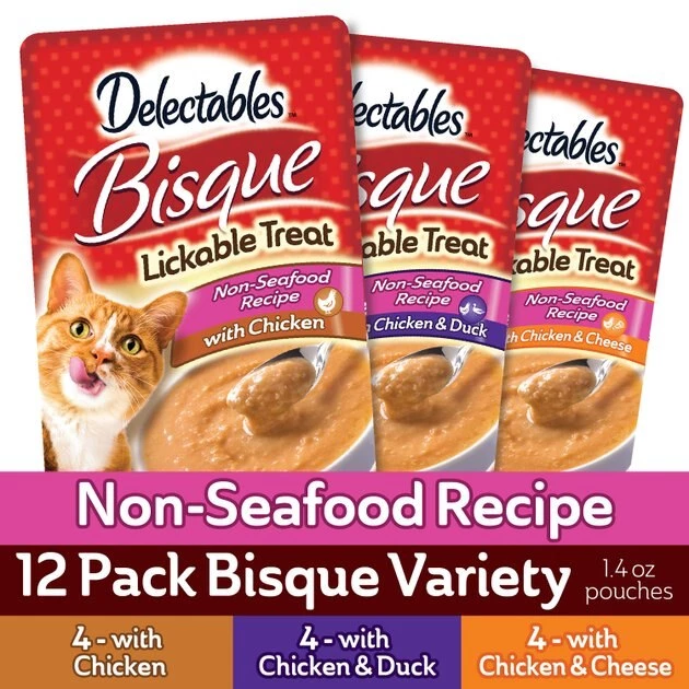 Your favorite feline is going to love these Hartz Delectables Non-Seafood Bisque Variety Pack Lickable Cat Treats. Now that there are Delectables in seafood-free options, your kitty will get to enjoy real meaty protein from land! This variety pack includes three purr-worthy recipes—Chicken, Chicken & Duck and Chicken & Cheese. All three recipes entangle meat in a scrumptious sauce, ensuring that your kitty eats the entire treat and not just the sauce. Even the finickiest felines will enjoy this meaty treat! Each single-serve pouch may be used as a quick snack, a speciall treat or as a tasty food topper.