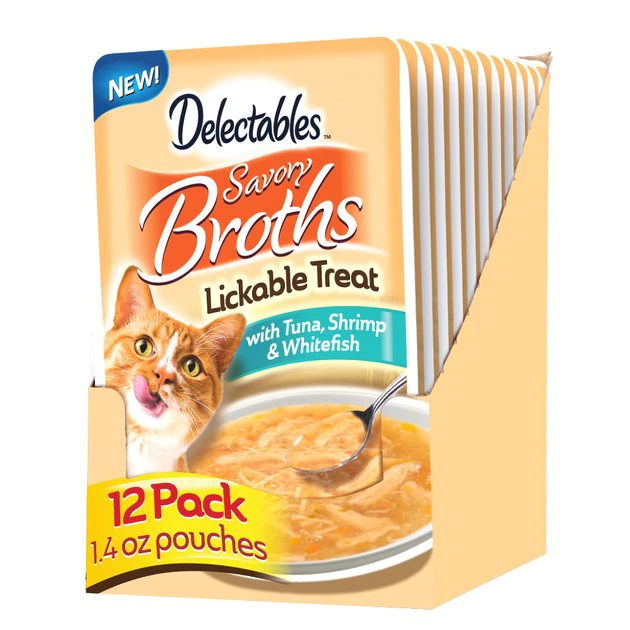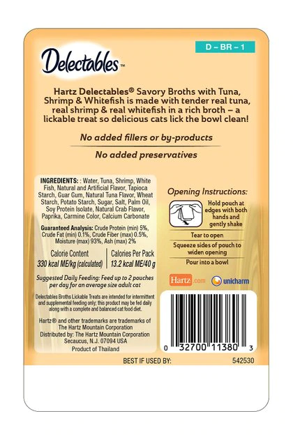 Your kitty companion is sure to savor every drop of Hartz Delectables Savory Broths Tuna, Shrimp & Whitefish Lickable Treats! This rich broth features a feline-approved combination of real whitefish, shrimp, and tuna. The recipe is grain-free and made without fillers, artificial preservatives, colors, and by-products. On top of that, the lickable treat also delivers a delicious hydration boost. Whether you serve it as a scrumptious snack or tasty topper, no cat can resist a Delectables Savory Broth!