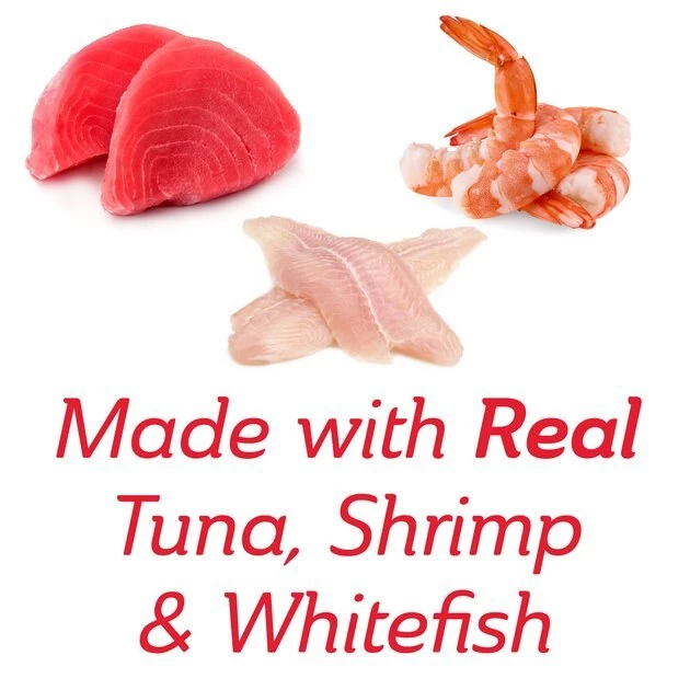 Water, Tuna, Shrimp, White Fish, Natural and Artificial Flavor, Tapioca Starch, Guar Gum, Natural Tuna Flavor, Wheat, Starch, Potato Starch, Sugar, Salt, Palm Oil, Soy Protein Isolate, Natural Crab Flavor, Paprika, Carmine Color, Calcium Carbonate.