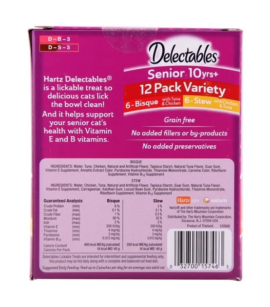 Treat your kitty to the best of both land and sea with Hartz Delectables Senior 10+ Stew & Bisque Variety Pack Lickable Cat Treats. Each case comes with six packets of Tuna & Chicken Bisque recipes and six Chicken & Tuna Stew recipes. The Bisque offers a smooth texture, while the Stew delivers a hearty consistency that’s sure to please the finickiest felines. These delicious and nutritious gourmet lickable cat treats are crafted with either real fish or chicken for the high-quality protein your BFF deserves and is specially crafted for senior sidekicks 10 years and older! Simply open the pouch, pour it into a bowl, and let him enjoy the rich reward as a snack between meals or as a tasty kibble topper. Any way you serve it, these purr-worthy treats will leave your cat licking his chops!