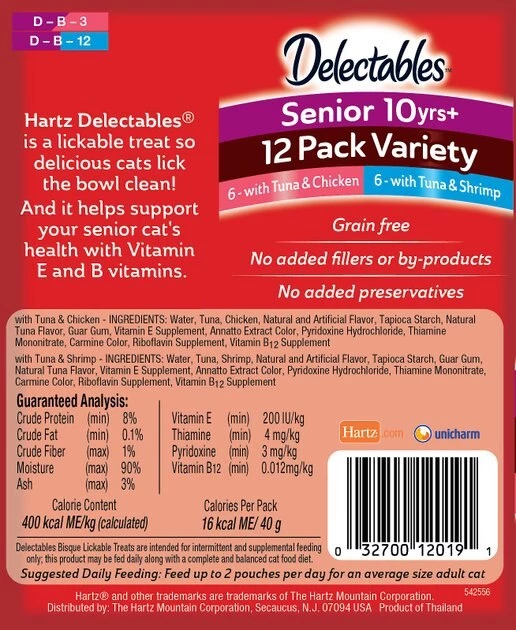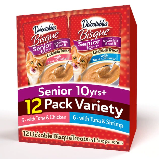 Treat your kitty to the best of both land and sea with Hartz Delectables Senior Bisque Variety Pack Lickable Cat Treats. Each case comes with six packets of Tuna & Chicken Senior Bisque recipes and six packets of Tuna & Shrimp Senior Bisque recipes. They feature tender chicken, shrimp and succulent fish in a smooth, satisfying sauce that’s sure to please the finickiest felines. Specially crafted for senior cats 10 years and older, these lickable cat treats are made with added vitamin E and B vitamins to support your old gal’s overall health and they make the purr-fect anytime snack or tasty food topper. Simply open the pouch and watch your sidekick enjoy the wet texture and small wet flakes. Any way you serve it, these purr-worthy treats will leave your cat licking his chops! Delectables also come in other texture varieties including Stew, Chowder and Squeeze Ups (sold separately).
