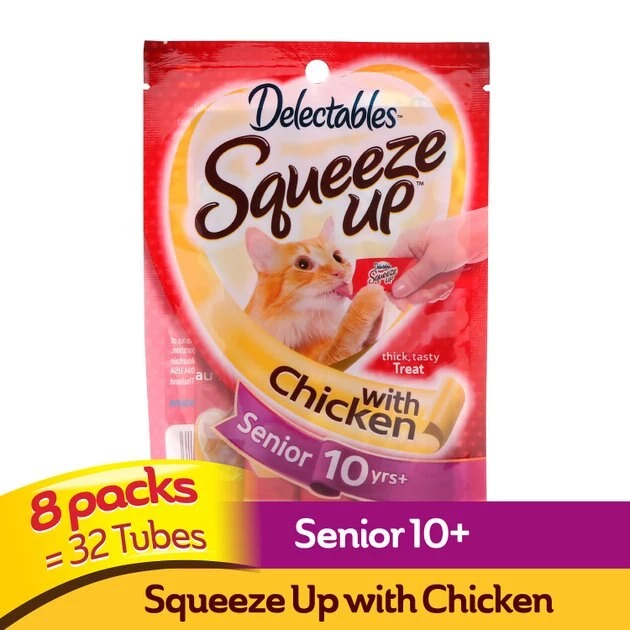 - Chicken Squeeze Up puree is made with real chicken and tuna and specially formulated for senior cats 10 years of age and older.