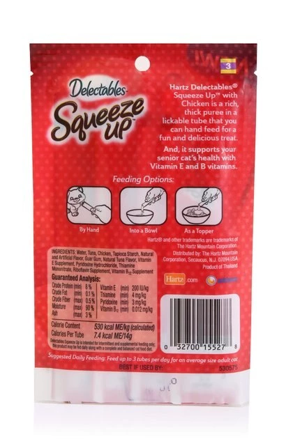 Squeeze up some fun with Hartz Delectables Senior Squeeze Up Chicken Lickable Cat Treats. Each .5 ounce lickable tube is stuffed with a rich and thick creamy puree in lip smacking flavors cats find paw-sitively delicious! Squeeze Ups provide the perfect bonding experience between you and your senior cat companion and are a new, exciting way to reward your furry friend. This tasty Squeeze Up puree is made with real chicken and tuna and has vitamin E and B vitamins to support your senior cat’s health. This tasty puree can be hand fed, squeezed into a bowl or used as a savory food topper to entice finicky eaters. Give your cat a new snacking experience that’s fun for the both of you with Hartz Delectables Squeeze Ups. Meow we’re talking!