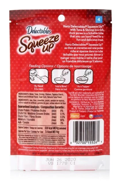 Squeeze up some fun with Delectables interactive wet cat treats. Each .5 ounce lickable tube is stuffed with a rich and thick creamy puree in lip smacking flavors cats find paw-sitively delicious! Squeeze Ups provide the perfect bonding experience between you and your cat companion and are a new, exciting way to reward your furry friend. This tasty Squeeze Up puree is made with real tuna, shrimp and chicken and can be hand fed, squeezed into a bowl, or used as a savory food topper to entice finicky eaters. Give your cat a new snacking experience that’s fun for the both of you with Hartz Delectables Squeeze Ups. Meow we’re talking!