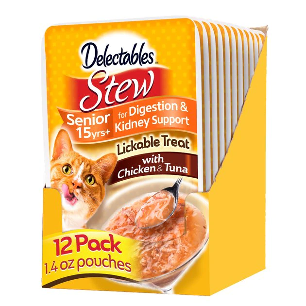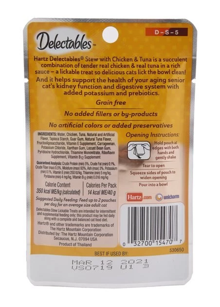 Hartz Delectables Stew Chicken & Tuna Lickable Cat Treat is a deliciously unique, single serve, wet treat cats purr for. Your cat will enjoy this yummy combination of tender, real chicken and tuna chunks in a rich sauce. Formulated with vitamin E, B vitamins, potassium and prebiotics for digestion and kidney support, this treat is made to support the health of your aging cat, 15 years and over. Make every treat time something truly special with this lickable, tasty treat your cat will crave.