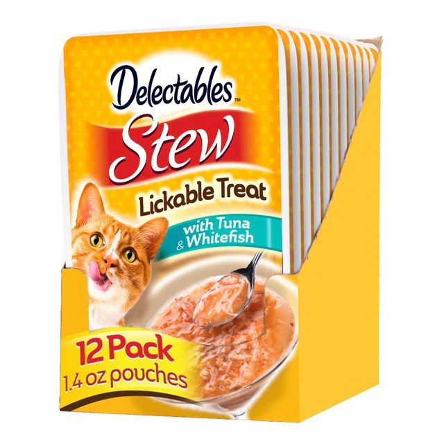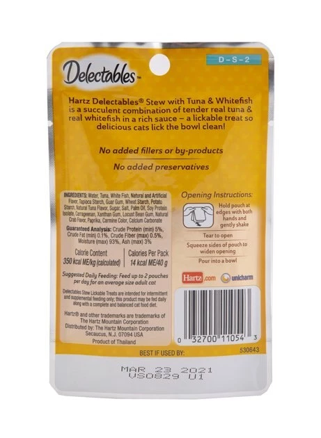 Hartz Delectables Stew Tuna & Whitefish Lickable Cat Treat is a deliciously unique, single serve, wet treat cats purr for. Your cat will enjoy this yummy combination of tender, real tuna and whitefish chunks in a rich sauce. Make every treat time something truly special with this lickable, tasty treat your cat will crave.