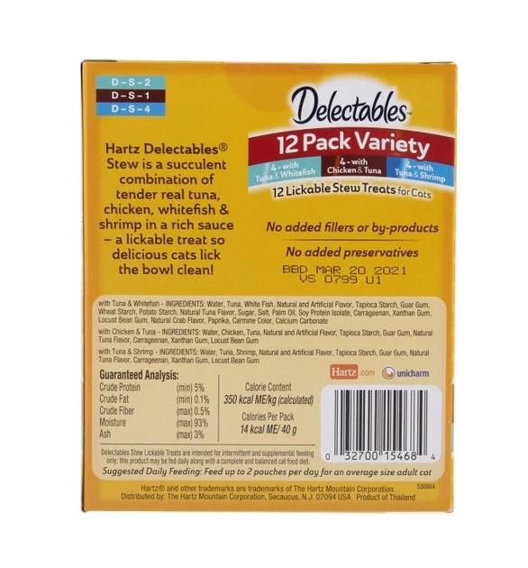 Treat your kitty to the best of both land and sea with Hartz Delectables Stew Variety Pack Lickable Cat Treats. Each case comes with 12 Stew packets in three scrumptious flavors—Tuna & Whitefish, Chicken & Tuna, and Tuna & Shrimp. Hartz Stew recipes are crafted with either real fish or chicken for the high-quality protein your BFF deserves and offer a hearty consistency that’s sure to please the finickiest felines! Simply open the pouch, pour it into a bowl, and let him enjoy the rich reward as a snack between meals or as a tasty kibble topper. Any way you serve it, these purr-worthy treats will leave your cat licking his chops!