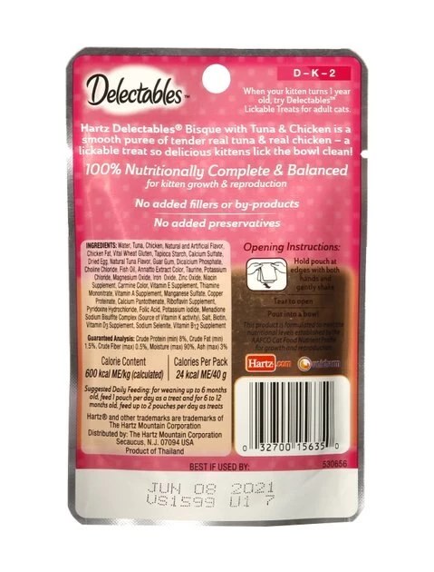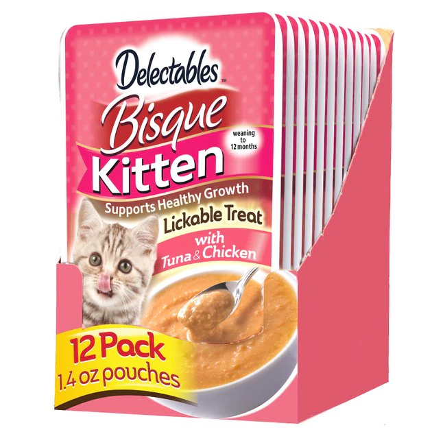Treat your kitty to the lickable deliciousness he craves with the Hartz Delectables Tuna & Chicken Bisque Lickable Kitten Treats. The tasty formula is made with tender real tuna and chicken, and blended into a succulent, bisque-style puree that growing kittens love to lap up. It’s got plenty of vitamins, minerals and taurine so it can be part of a 100% nutritionally complete and balanced diet to support healthy development. Plus, the easy-to-serve pouch makes treat time a cinch—just shake, tear, pour and let the lapping begin!