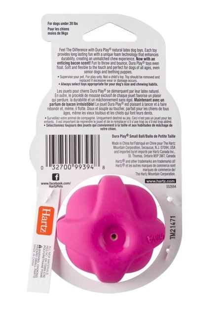 Give fetch a new feel with the Hartz Dura Play Ball Dog Toy. Made from a natural latex, this toy provides long-lasting fun with a unique foam technology that is ultra-durable. It’s an unmatched experience for your furry friend—especially with an enticing bacon scent! Just be warned, he might not want to hand it back over when it’s time for the next throw. It’s fun to toss and bounce, and it even floats in water. Soft and flexible to the touch, it’s perfect for dogs of all ages, including senior dogs and teething puppies.