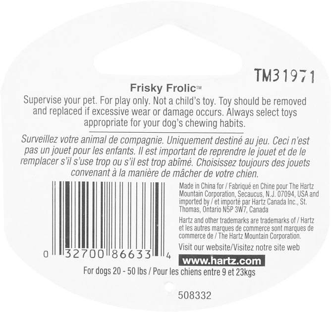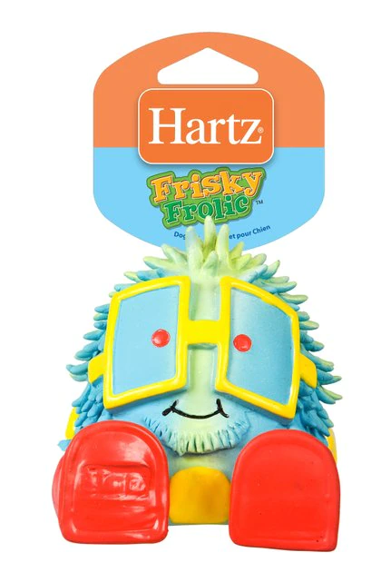 Hartz Frisky Frolic Latex Squeakable Dog Toy brings chewing, chasing and fetching fun to your pup. These charming characters are full of color and attitude, taking cool to a whole new level. Made from rugged latex material, these toys are made to last. Their textured surface provides a fun and stimulating chew experience. Great for hours of indoor or outdoor play.