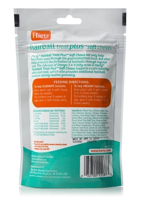 To help eliminate hairballs: Give Adult cats 5 soft chews daily until symptoms disappear. For kittens over 4 weeks of age, give 3 soft chews daily.