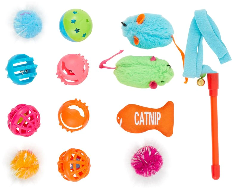 - Packs 13 kitty-approved toys including balls, pompoms, catnip-stuffed fish and mice, and a wand baton.