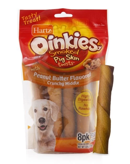 Keep your canine companion happy and occupied with Hartz Oinkies Pig Skin Twists with Peanut Butter Flavor Crunchy Middle Dog Treats! These savory pig skins are oven-baked, and stuffed with a mouthwatering, crunchy peanut butter flavored center for a treat your dog will love! Satisfy your pal’s instinct to chew with this long-lasting, tasty treat, packed with flavor through and through! Oinkies Smoked Pig Skin Twists are baked, smoked and then baked again to lock in that rich, savory flavor that will have your pup drooling with delight every time!
