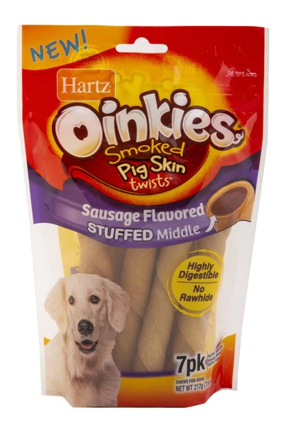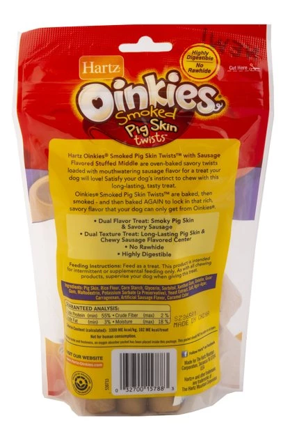 Reward your “good boy” with Hartz Oinkies Smoked Pig Skin Twists Sausage Flavored Stuffed Dog Treat! These tasty twists are hand rolled from 100% real pig skin and stuffed with a savory sausage flavor for a treat experience your dog will love! They are baked, smoked and then baked a second time to lock in flavor and create a tempting texture for a satisfying chewing experience. They are also completely free of rawhide for easy digestion, so you can feel good feeding them to your furry friend.