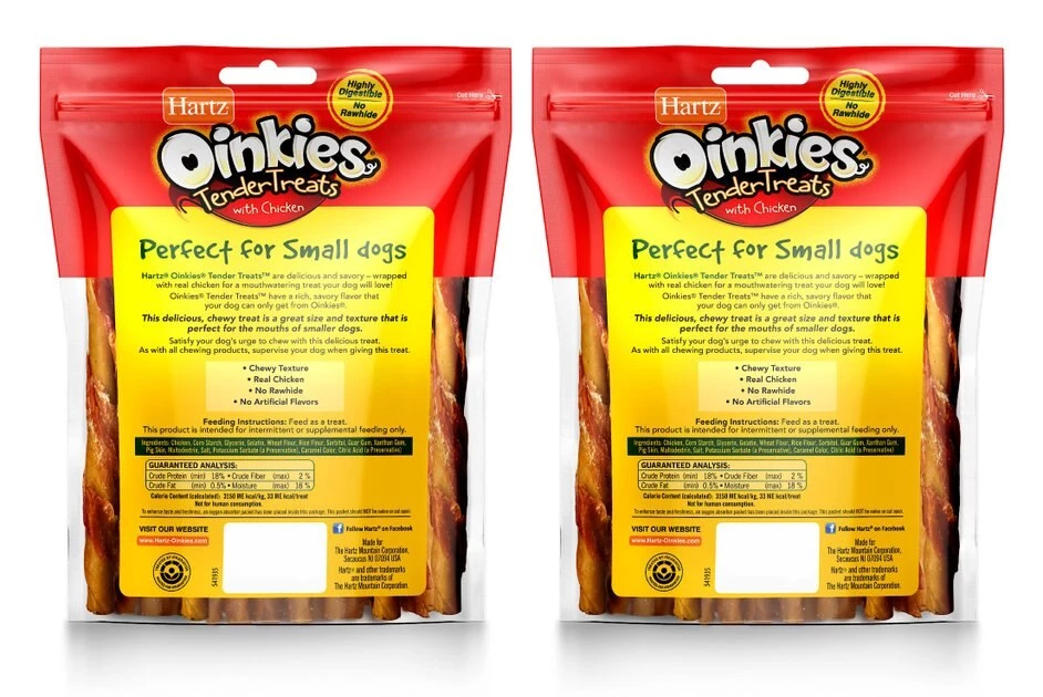 Keep your canine companion happy and occupied with Hartz Oinkies Tender Treats Wrapped with Real Chicken Dog Treats. These irresistible, savory treats are wrapped in 100% real chicken and flavored to paw-fection. What’s more, they are rawhide-free, making them highly digestible. The chewy texture makes these chews a great choice for older dogs with sensitive teeth and smaller dogs with little mouths!