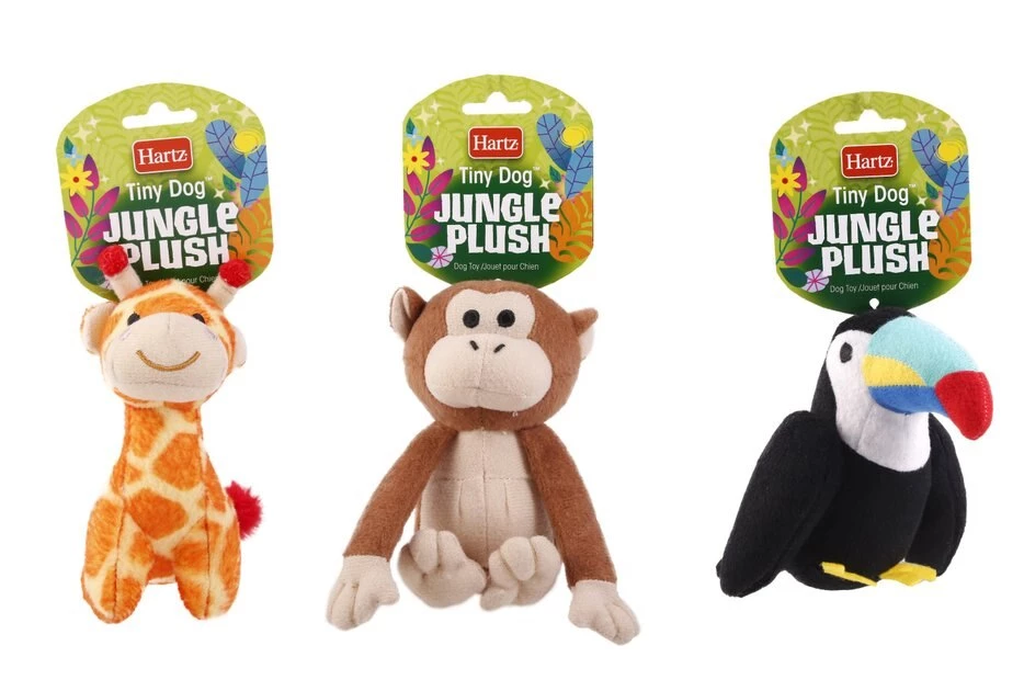 Hartz Tiny Dog Jungle Plush Dog Toys are perfect for your small dog or puppy. These plush toys are soft, cuddly, and lightweight, each adorable animal comes with a squeaker, sure to provide hours of fun.