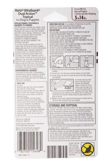 Do not use on cats. Read entire label before each use. Use only on dogs or on puppies 12 weeks of age or older. Do not use on dogs or puppies weighing less than 5 pounds. Causes moderate eye irritation. Avoid contact with eyes, skin or clothing. Wash hands thoroughly with soap and water after handling and before eating, drinking, chewing gum, using tobacco or using toilet. .