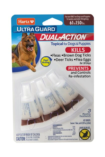 Help your canine companion fight pesky fleas and ticks with this Hartz UltraGuard Dual Action Flea & Tick Topical Dog Treatment! This fast-acting formula helps to kill fleas along with brown dog ticks, deer ticks, plus it helps to prevent re-infestations. This formula lasts for 30 days, which means you only need to apply it once a month. Plus, the quick drying formula stays on, ensuring your pal stays protect throughout the month. This package contains 3 monthly applications. When it comes to flea and tick control, Hartz has got your pal covered!