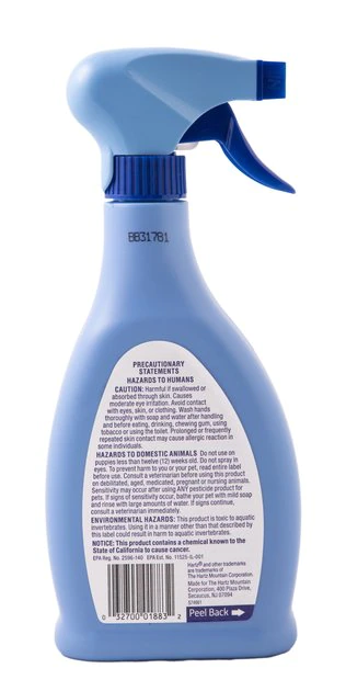 Do not use on cats. Read entire label before each use. Use only on dogs or on puppies 12 weeks of age or older. CAUTION: Harmful if swallowed or absorbed through skin. HAZARDS TO HUMANS AND DOMESTIC ANIMALS: Causes moderate eye irritation. Avoid contact with eyes, skin, or clothing. Wash thoroughly with soap and water after handling. Prolonged or frequently repeated skin contact may cause allergic reaction in some individuals. Do not use on puppies under 12 weeks of age. Do not spray in eyes. To prevent harm to you or your pet, read entire label before use. Consult a veterinarian before using this product on debilitated, aged, pregnant, nursing, or medicated animals. Sensitivity may occur after using ANY pesticide product for pets. If signs of sensitivity occur, bathe your pet with mild soap and rinse with large amounts of water. If signs continue, consult a veterinarian immediately.